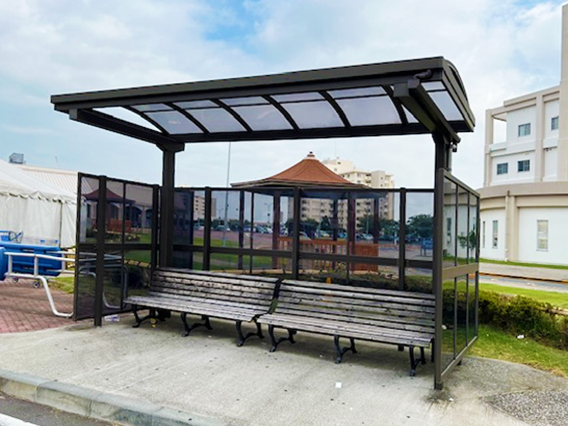特殊な部材を使用し設置しています。 風を受ける場所が多く、補強にも気を使っています。 通常の仕様だけでなく、オリジナルの停留所を作りました。