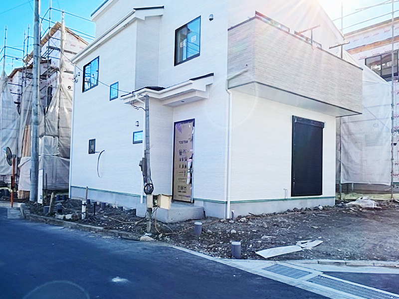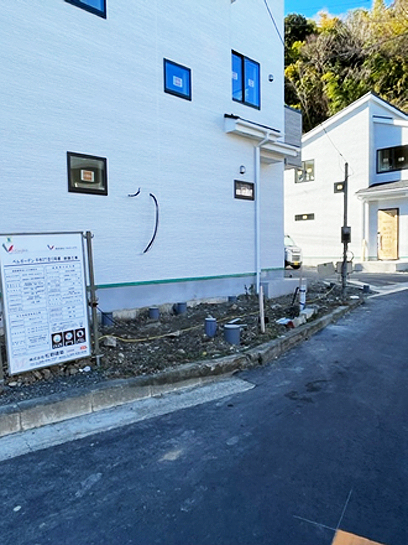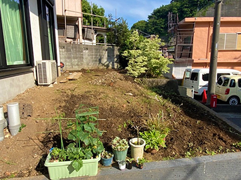 販売予定だとこのままの状態にて、道路側のみコンクリート打ち、集合ポスト・玄関タイル張り工事、市の条例にてレッドロビンを5本植えるだけでした。